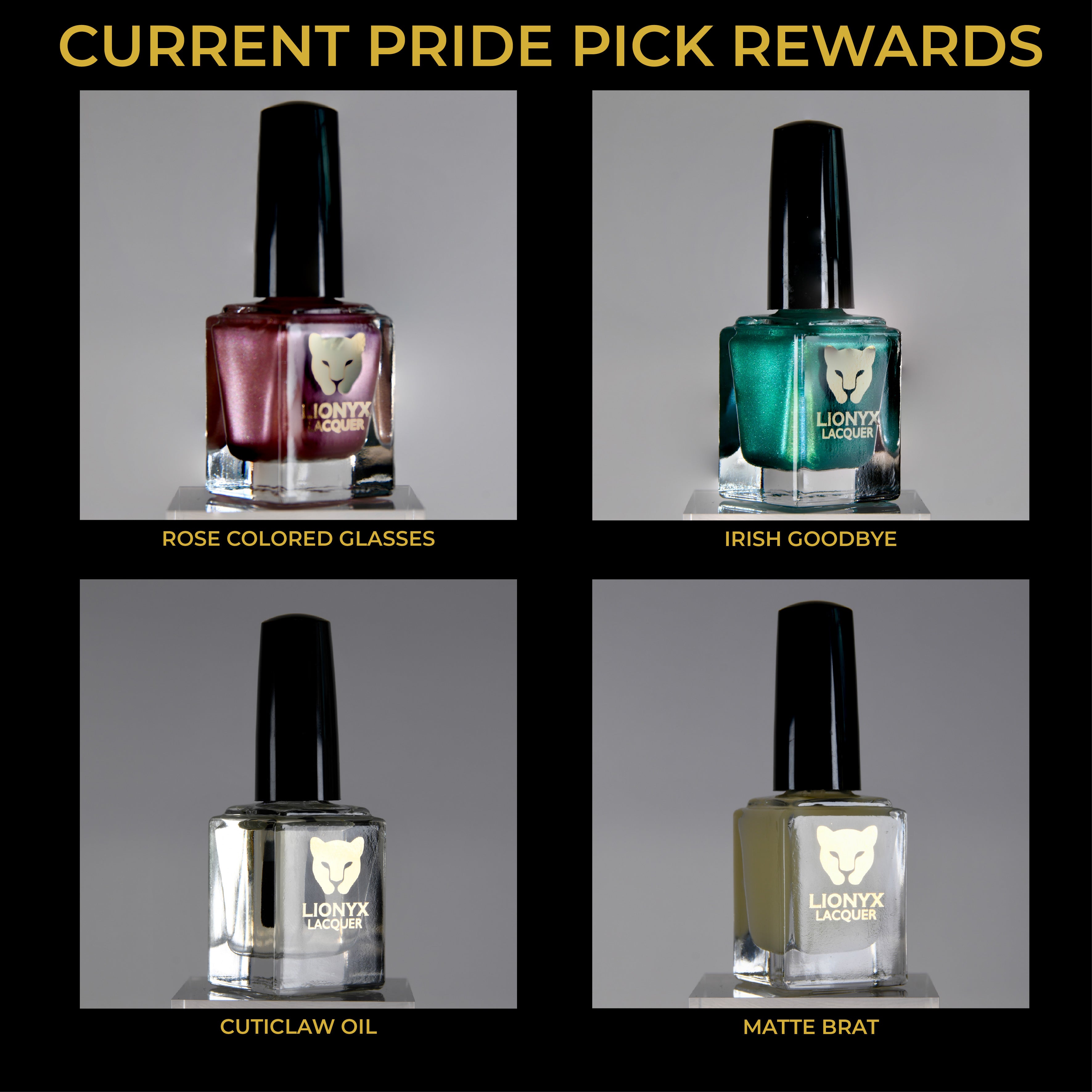 PRIDE PICK rewards rotate regularly and may include current shades, past favorites, or occasional exclusives.